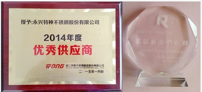 近日公司营销方面再传喜讯,先后荣获浙江东明不锈钢制品股份有限公司颁发的“优秀供应商”和江阴祥瑞不锈钢精线有限公司颁发的“最温暖合作伙伴”称号。